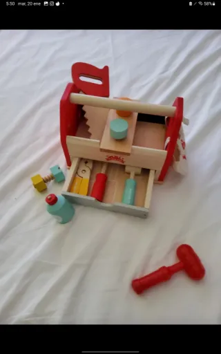 Caja de herramientas de madera de la marca Le Toy Van, ideal para pequeños manitas. - Incluye varias herramientas de madera y regalo herramienta de plástico. - Diseño colorido y atractivo. - Fomenta el juego creativo.