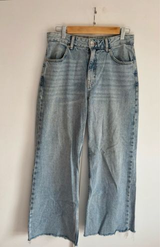 Vaqueros de corte ancho en tono azul claro. Tienen un diseño moderno y cómodo. - Cintura alta. - Bolsillos delanteros y traseros. - Bajo deshilachado.