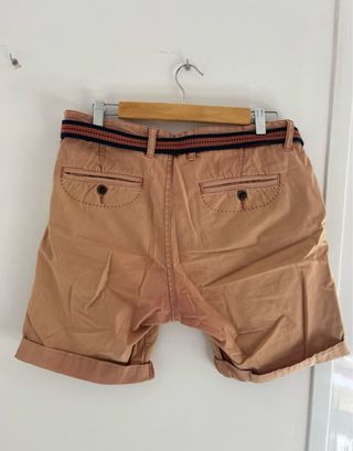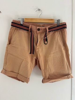 Pantalón corto estilo lavado. - Cinturón de tela con rayas azules y naranjas. - Dobladillo en los bajos.