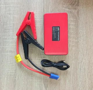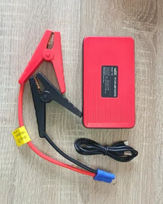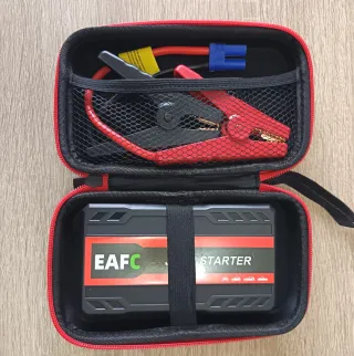 Arrancador portátil EAFC para coche, ideal para emergencias. 600A pico para coche de 3litros coche moto y POWER bank linterna - Incluye pinzas de arranque rojas y negras. - Cable con conector azul. - Viene en un estuche de transporte con cremallera.