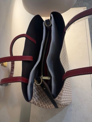 Elegante bolso Carolina Herrera modelo Matryoska. - Diseño con monograma CH. - Combinación de colores beige y rojo. - Incluye candado decorativo.