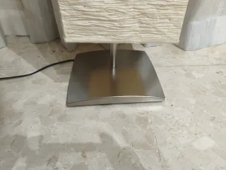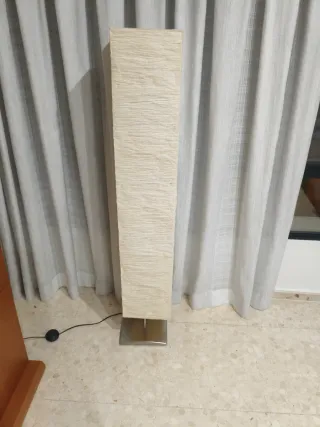 Elegante lámpara de pie con un diseño moderno y estilizado. Su combinación de colores la hace versátil para cualquier espacio. - Base y estructura de metal - Pantalla de papel con textura. - 3 bombillas Altura 1,50