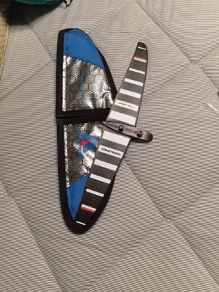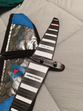 Estabilizador Armstrong Speed 180 para wingfoil. Diseño moderno con detalles en blanco, negro y rojo. - Material: Carbono. - Acabado: Negro con franjas blancas y detalles rojos. - Incluye funda protectora con detalles en azul y plateado.