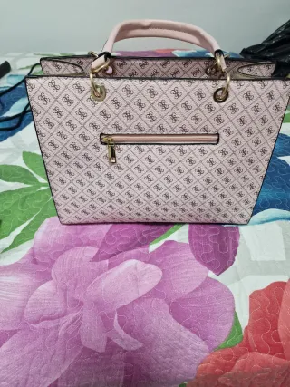 Elegante bolso de mano y bandolera en tono rosa, con un diseño estampado y detalles metálicos. - Acabado con tachuelas doradas en los laterales. - Placa decorativa dorada en la parte frontal. - Asas superiores y correa para llevar al hombro.
