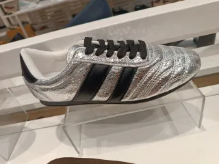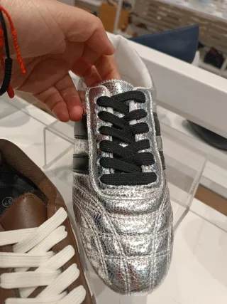 Zapatillas deportivas con un diseño llamativo. - Acabado metalizado plateado. - Detalles de rayas negras. - Cierre con cordones negros. Diferentes tallas 35 hasta 41 Por cierre tienda