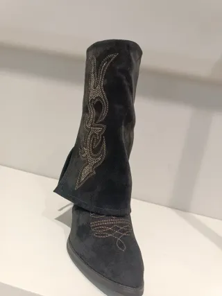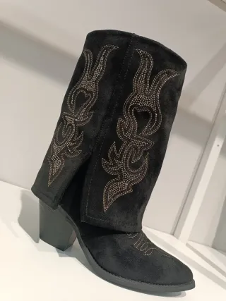 Botas de estilo cowboy en ante negro con un diseño de bordado plateado. - Material: Ante. - Color: Negro. - Detalle de bordado plateado en la caña y la punta. - Tacón grueso. Diferentes tallas 35 hasta 41 Por cierre tienda