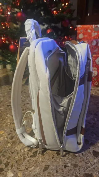 Mochila Samsonite BIZ de color marfil con detalles en marrón. - Compartimento principal con capacidad para portátil de 14,1 pulgadas. - Bolsillo frontal con organizador. - Asa superior y correas ajustables para los hombros. - Diseño moderno y funcional.