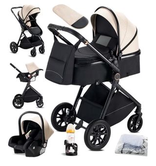 Conjunto de carrito de bebé versátil y elegante, ideal para paseos cómodos. - Incluye capazo, silla de paseo y silla de coche. - Diseño moderno en color negro y beige. - Incluye bolso y portabiberones.