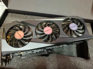 Tarjeta gráfica Gigabyte con tres ventiladores para una refrigeración eficiente. - Diseño con tres ventiladores. - Logo de Gigabyte en el centro de los ventiladores.