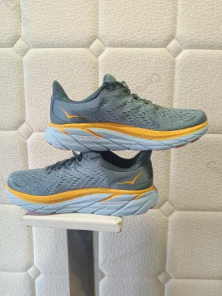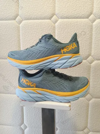 Zapatillas Hoka Clifton 8 en tonos grises y naranjas. Diseñadas para ofrecer comodidad y rendimiento. - Parte superior de malla transpirable. - Entresuela con amortiguación. - Suela de goma duradera.