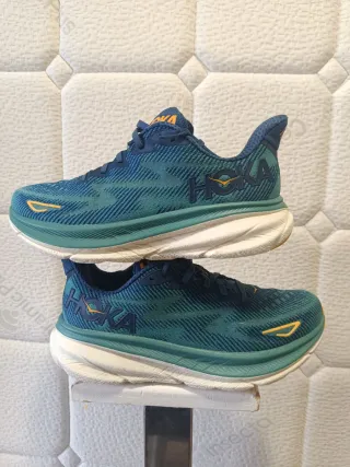 Zapatillas Hoka Clifton 9 en tonos azules y verdes. Diseñadas para ofrecer comodidad y rendimiento. - Parte superior de malla transpirable. - Entresuela de espuma CMEVA. - Suela de goma duradera.