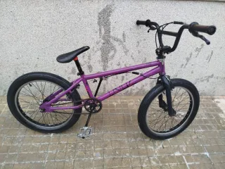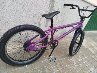 Bicicleta BMX Freestyle en color morado, lista para la acción. - Cuadro de acero resistente. - Ruedas de 20 pulgadas. - Manillar de 4 piezas. - Frenos V-brake.