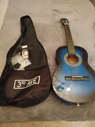 Guitarra clásica para niños, ideal para iniciarse en la música. Incluye accesorios para empezar a tocar de inmediato. - Guitarra clásica de color azul. - Funda de transporte. - Afinador. - Cuerdas adicionales.