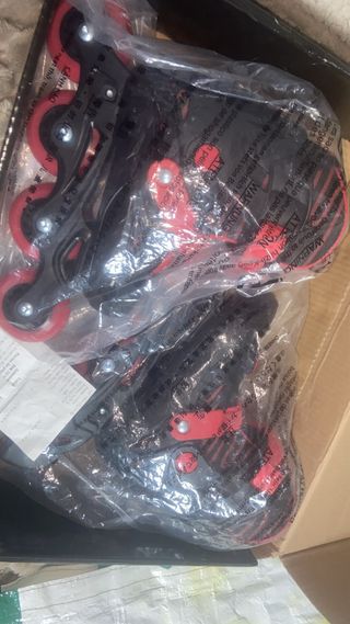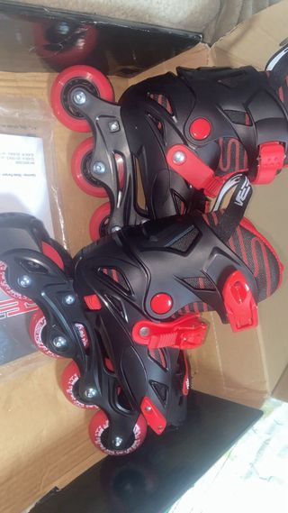 Patines en línea para niños, con un diseño moderno en negro y rojo. - Ruedas rojas. - Cierre de velcro y hebilla.