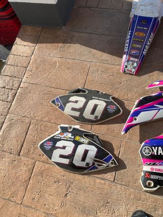 Se venden kits de plásticos para Yamaha YZF 250 del año 2008. Incluyen varios elementos de marcas reconocidas. - Placas frontales y laterales con número 20 y nombre Raul Gonzalez. - Logos de Maxxis, ProTaper, Twin Air, Hinson, AMA y Akrapovič. - Diseño en negro, blanco y azul con detalles rosas y morados. PREGUNTAR PRECIO