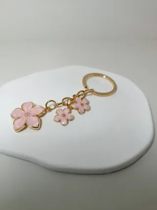 Llavero con un diseño delicado de flores de cerezo. - Tres colgantes en forma de flor. - Color rosa con detalles dorados. - Anilla metálica dorada.