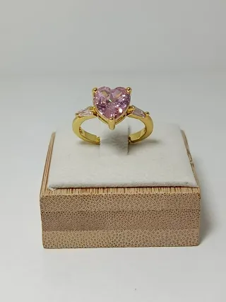 Elegante anillo con un diseño de corazón en color rosa, perfecto para añadir un toque de brillo. - Diseño de corazón. - Circonita rosa. - Baño de oro. - Talla ajustable.