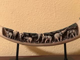 Pieza decorativa vintage con forma de diente de mamut tallado. Presenta una escena de elefantes en relieve. - Detalle de elefantes en procesión. - Adornos metálicos en los extremos. - Base de soporte incluida. -Material : Plástico