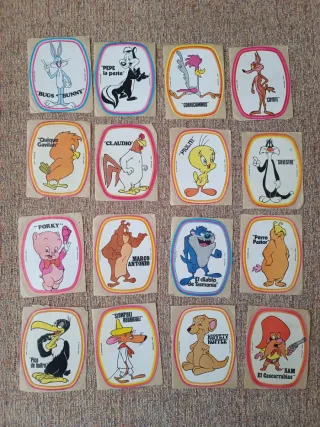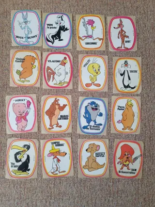 Colección de pegatinas de personajes de Warner Bros de los años 80. - Incluye Bugs Bunny, Pepe la Peste, Correcaminos, Coyote, Quique Gavilán, Claudio, Piolín, Silvestre, Porky, Marco Antonio, El Diablo de Tasmania, Perro Pastor, Pico de buitre, Slowpoke Rodriguez, Hippety Hopper y Sam El Cascarrabias. - Diseños vintage de Avery. -Muy difíciles de conseguir.En muy buen estado.