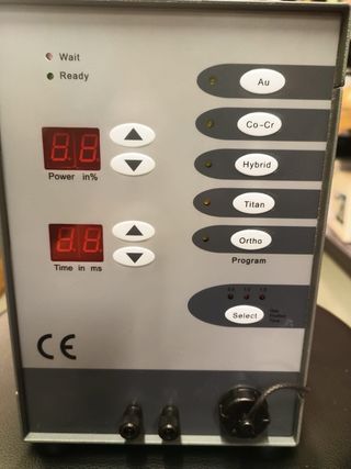 Equipo de soldadura por puntos para joyería. para trabajos de joyería Permite seleccionar diferentes programas y ajustar la potencia y el tiempo. - Indicadores de Wait y Ready. - Pantalla digital para Power in % y Time in ms. - Botones de ajuste de potencia y tiempo. - Programas seleccionables: Au, Co-Cr, Hybrid, Titan, Ortho. - Selector de programa con diferentes niveles (0.5, 1.0, 1.5). - Conexiones traseras. - Certificación CE. - control numérico automático - Soldador de arco argon de pulso - soldador de puntos para soldad - Incluye mango de soldadura. - Incluye filtro de aire. - Incluye cable de alimentación. - Incluye manual.