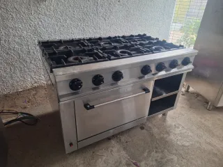 Cocina industrial de acero inoxidable con seis quemadores y horno. - Superficie de cocción de gas. - Horno integrado. - Construcción robusta de acero inoxidable.