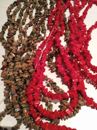 Conjunto de tiras de chips de piedra natural, perfectas para bisutería. - Piedras con forma irregular. - Variedad de tonos verdes y rojizos. 5 unakita mes 4 coral de 85 cm