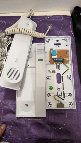 Interfono de la marca Fermax en color blanco. El dispositivo está abierto mostrando su placa base y cableado. - Placa base con conexiones. - Cableado de colores (verde, amarillo, rojo, marrón). - Botón azul de llamada.