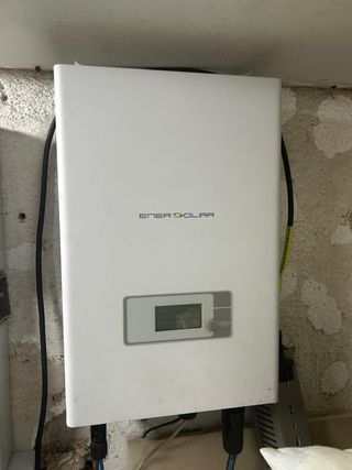 Inversor solar de la marca EnerSolar, diseñado para sistemas fotovoltaicos. - Unidad blanca con pantalla y botones de control. - Conexiones en la parte inferior. Conexión exclusiva a red. Auto consumo.