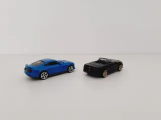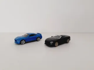 Dos coches de juguete Matchbox Ford Mustang. - Un Mustang en color azul con alerón. - Un Mustang descapotable en color negro con llantas doradas.