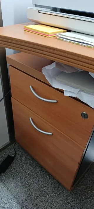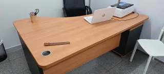 Mesa de despacho con un diseño moderno y funcional. Combina materiales para un acabado elegante. - Superficie principal de madera. - Color principal marrón y negro.