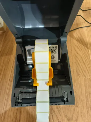 Impresora de etiquetas Zebra ZD220. - Diseño moderno en color gris. - Panel frontal con indicador de encendido y estado.