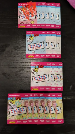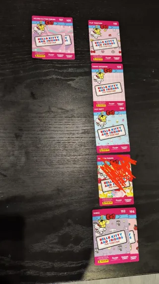 Colección de cartas coleccionables de Hello Kitty and Friends. 6 cartas 1 € + (gastos de envio ordinario) Los numeros que tengo repetidos estan en las fotos si tienes los que me faltan tambien podemos cambiarlos. Me faltan 1-3-6-13-14-17-18-21-25--46---78-81-88-91-92-93-94-97-98 -100-104-106-108-109-110-117- 126-127-131-136-137-139-141-144- 146-147-149-150-151-159--170-187-188-189--196-197 - Incluye cartas de Hello Kitty, My Melody y Kuromi. - Temática Fun Together. - Cartas de la marca Panini.