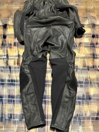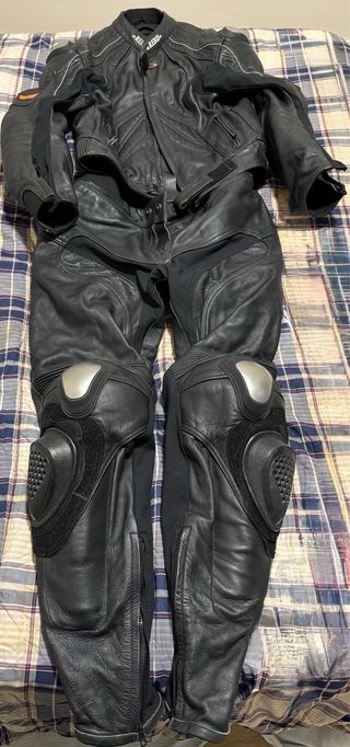 Conjunto de mono de dos piezas para moto de estilo deportivo. Talla (m) Entre 1’68-175 Peso 65 k a 75 k - Chaqueta de cuero negra. - Pantalones de cuero negros con protecciones. - Diseño de dos piezas Me lo he puesto muy pocas veces y lo vendo porque me queda pequeño Precio negociable