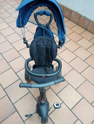 Triciclo marca QPlay en color azul, ideal para paseos. - Capota protectora. - Barra de empuje. - Reposapiés. - Cinturón de seguridad.
