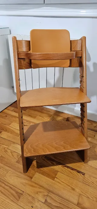 Silla evolutiva de madera de la marca Stokke, diseñada para acompañar el crecimiento de tu bebé y niño. - Fabricada en madera. - Diseño adaptable a diferentes edades. - Tiene algunas marcas en zonas de agarre, lo normal del uso, por lo demás esta en buen estado. Tiene adaptador de respaldo para primeros años.