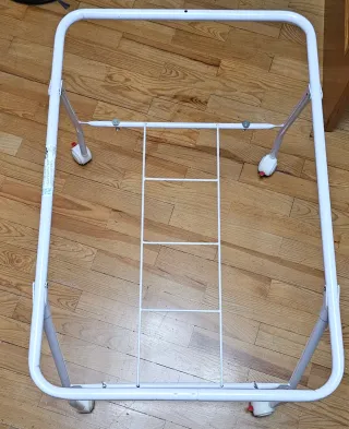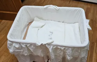 Minicuna con estructura metálica blanca. Incluye colcha a juego. - Estructura de metal. - Ruedas para facilitar el movimiento con frenos. - Colcha a juego incluida. - No tiene colchón.