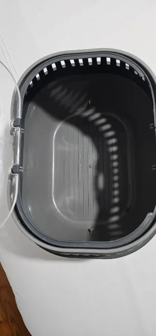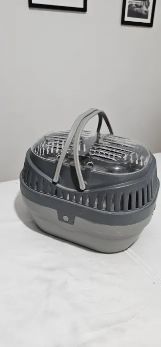Transportín diseñado para animales pequeños como chinchillas. Cuenta con una tapa transparente y rejillas para ventilación. - Asa superior para facilitar el transporte. - Cierre seguro.