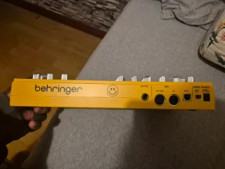 Sintetizador Behringer TD-3 en color amarillo. Este modelo es un bajo analógico. - Control de TUNE, CUTOFF, RESONANCE, DECAY, ENVELOPE, ACCENT. - Controles de DISTORTION, LEVEL, VOLUME. - Modos de TIME MODE, PITCH MODE, FUNCTION. - Botones de PLAY, WRITE, TRACK, PATTERN, TEMPO, MODE. - Conexiones SYNC, MIDI, USB, TRIG.