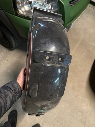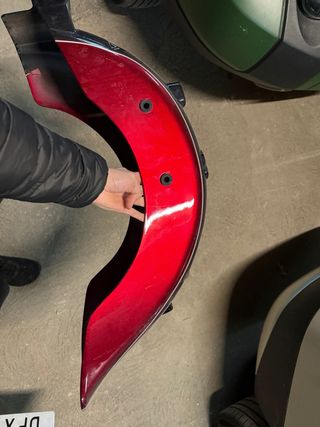 Guardabarros de color rojo brillante con un acabado metálico. Presenta un diseño curvo y aerodinámico. - Dos orificios para sujeción. - Borde negro.