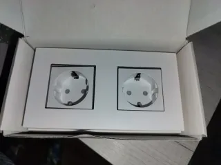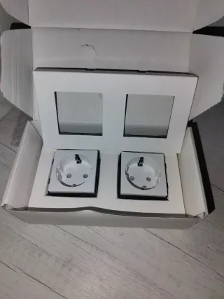 Enchufe doble de diseño moderno en color blanco. - Dos tomas de corriente. - Marco exterior blanco.