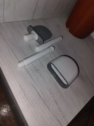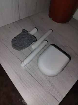 Set de escobilla de silicona para el baño, con mango y soporte. - Cabezal de silicona. - Mango desmontable en varias piezas. - Soporte blanco con tapa.