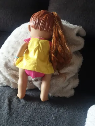Muñeca Baby Martina interactiva, habla y crece por fases. Hay videos en you tube para que lo podáis ver. - Pelo largo y castaño. - Ojos verdes. - Vestido amarillo con estampado de arcoíris y nubes. - Pulsera azul en la muñeca.