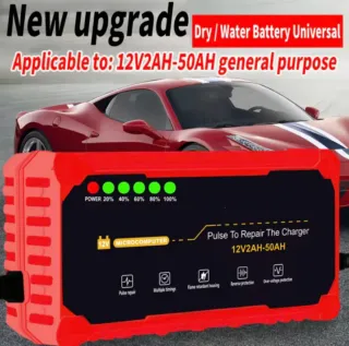 Cargador de batería universal para coches, compatible con baterías de 12V y rangos de 2AH a 50AH. Diseñado para carga y reparación de pulsos. - Indicadores LED de carga (20% a 100%). - Tecnología Microcomputer. - Función de reparación de pulsos. - Múltiples temporizaciones. - Carcasa ignífuga. - Protección contra polaridad inversa. - Protección contra sobretensión.