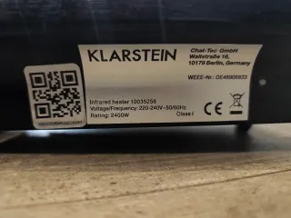 Calefactor infrarrojo de la marca KLARSTEIN. - Modelo: 10035258 - Potencia: 2400W - Voltaje/Frecuencia: 220-240V~50/60Hz - Clase I - Fabricante: Chal-Tec GmbH, Berlin, Germany - WEEE-Nr.: DE46906833