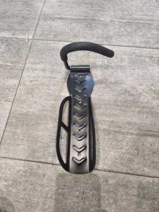 Soporte de pared para colgar bicicletas. Fabricado en metal negro con un recubrimiento de goma en el gancho. - Diseño robusto y duradero. - Ideal para ahorrar espacio en garajes o trasteros. - Incluye tornillos para su instalación.