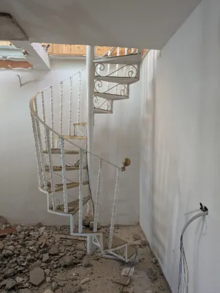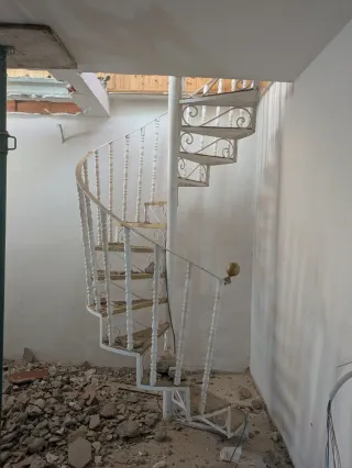 Escalera de caracol fabricada en hierro, ideal para espacios reducidos o como elemento decorativo. - Diseño clásico y elegante. - Estructura robusta de hierro.