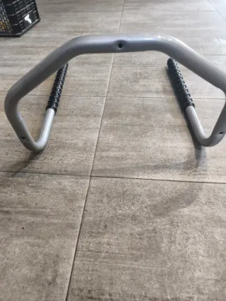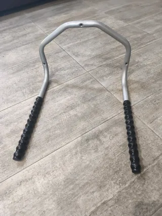 Soporte para bicicleta de gran tamaño, ideal para almacenamiento. - Estructura metálica resistente. - Mangos de goma negra para un mejor agarre. - Diseño en forma de U invertida.