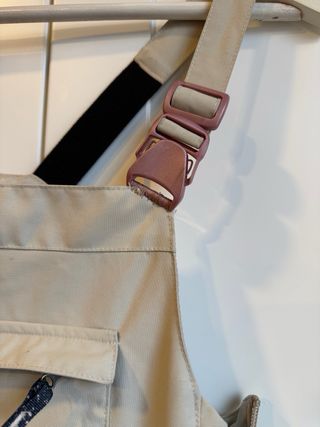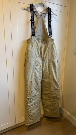 Peto de nieve color beige de la marca Dreamscape. SIN USAR PERO DESCOSIDO UN TIRANTE YA REPARADO - Diseño tipo peto. - Bolsillo frontal con cremallera. - Tirantes ajustables con hebillas UNO DESCOSIDO Y VUELTO A COSER