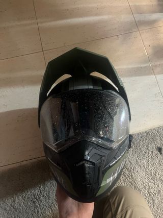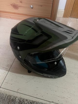 Casco de trail con un diseño moderno y llamativo. - Color principal verde con detalles en negro y gris. - Visera integrada. - Cierre de seguridad. -el intercomunicador no se vende -talla S -muy poco uso lo vendo por la talla