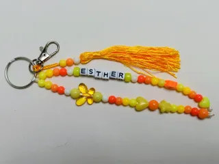 Llavero hecho a mano con cuentas de colores, lo hacemos personalizado con el nombre, o una palabra - Diseño colorido con cuentas de los colores que desees - Incluye abalorios con detalles ( flor, estrella, corazón, etc) - Puede llevar flecos o pieza de acrílico - Cierre de mosquetón plateado.